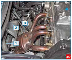 Расположение управляющего датчика концентрации кислорода:1 – место соединения колодки жгута проводов датчика с колодкой жгута проводов системы управления двигателем;2 – пластмассовый держатель жгута проводов датчика;3 – управляющий датчик концентрации кислорода. Сжав усики пластмассового держателя жгута проводов датчика, вынимаем держатель из отверстия в теплозащитном экране рулевого механизма.